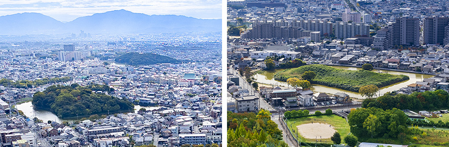 続いて南東に目を向けると、大小さまざまな古墳が点在しているのが分かります。視界の中央、濠にたっぷりと水をたたえるのが御廟山古墳。百舌鳥古墳群では4番目の規模を誇り、家形や盾、冑(かぶと)などさまざまな形象埴輪が出土しています。その奥に見えるのが、墳丘長約300mで全国7番目の大きさのニサンザイ古墳です。