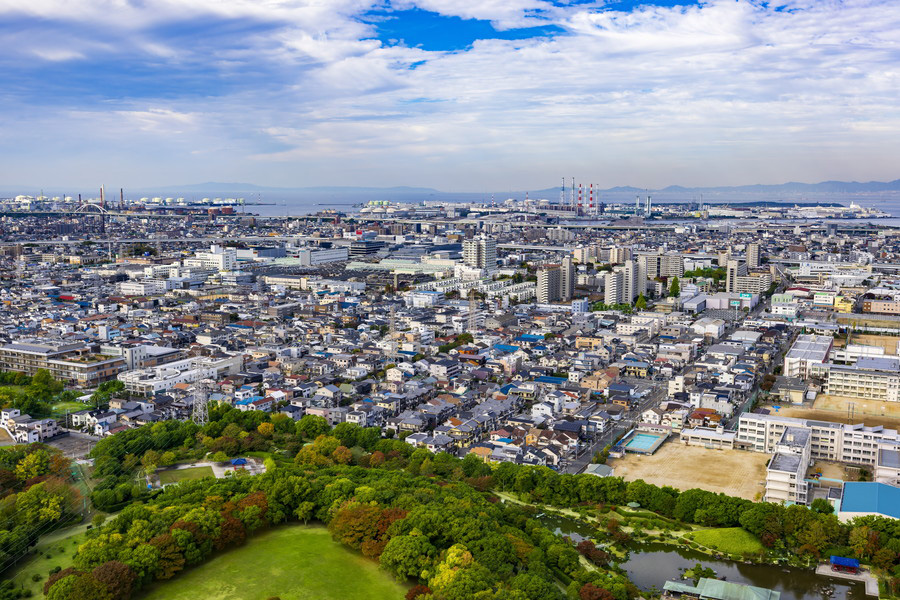 港町として栄えてきた堺では、海側の景色も見逃せません。西側には大阪湾が広がり、堺旧港や堺泉北臨海工業地帯、その先には淡路島、天気がよければ明石海峡大橋も望めます。