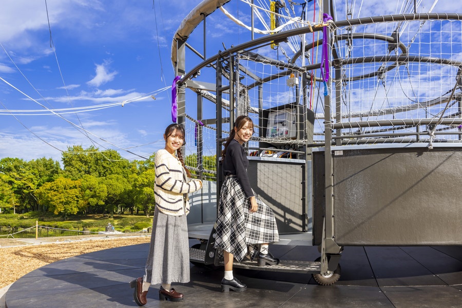 気球のりばがあるのは、堺市のシンボルパーク「大仙公園」のほぼ中央、仁徳天皇陵古墳のすぐ南側という、古墳を見るには絶好のロケーションです。気球フライトを今回体験したのは、堺観光コンシェルジュの田中美里さんと葛井紗羽さん。空に浮かぶ真っ白なバルーンを目印に、広大な園内を進んでいきます。事前予約を済ませていた二人は、QRコードをかざしてスムーズに受付完了。早速気球に乗り込みました。