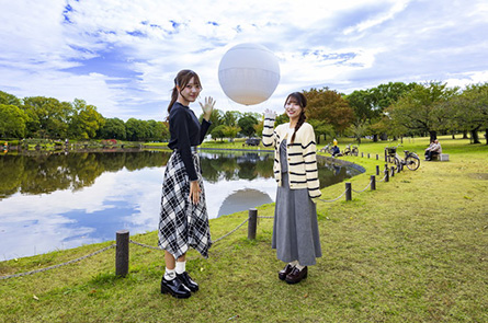 撮影スポットのおすすめは「DAISEN PARK」のモニュメント付近(大芝生広場)。真っ白な造形と気球、青空と緑のコントラストが見事で、絵になる1枚を撮影できます。ひょうたん型の「どら池」のほとりも人気のスポット。遠近法を使えばユニークな写真を撮れるかも!? ぜひトライしてみてください。