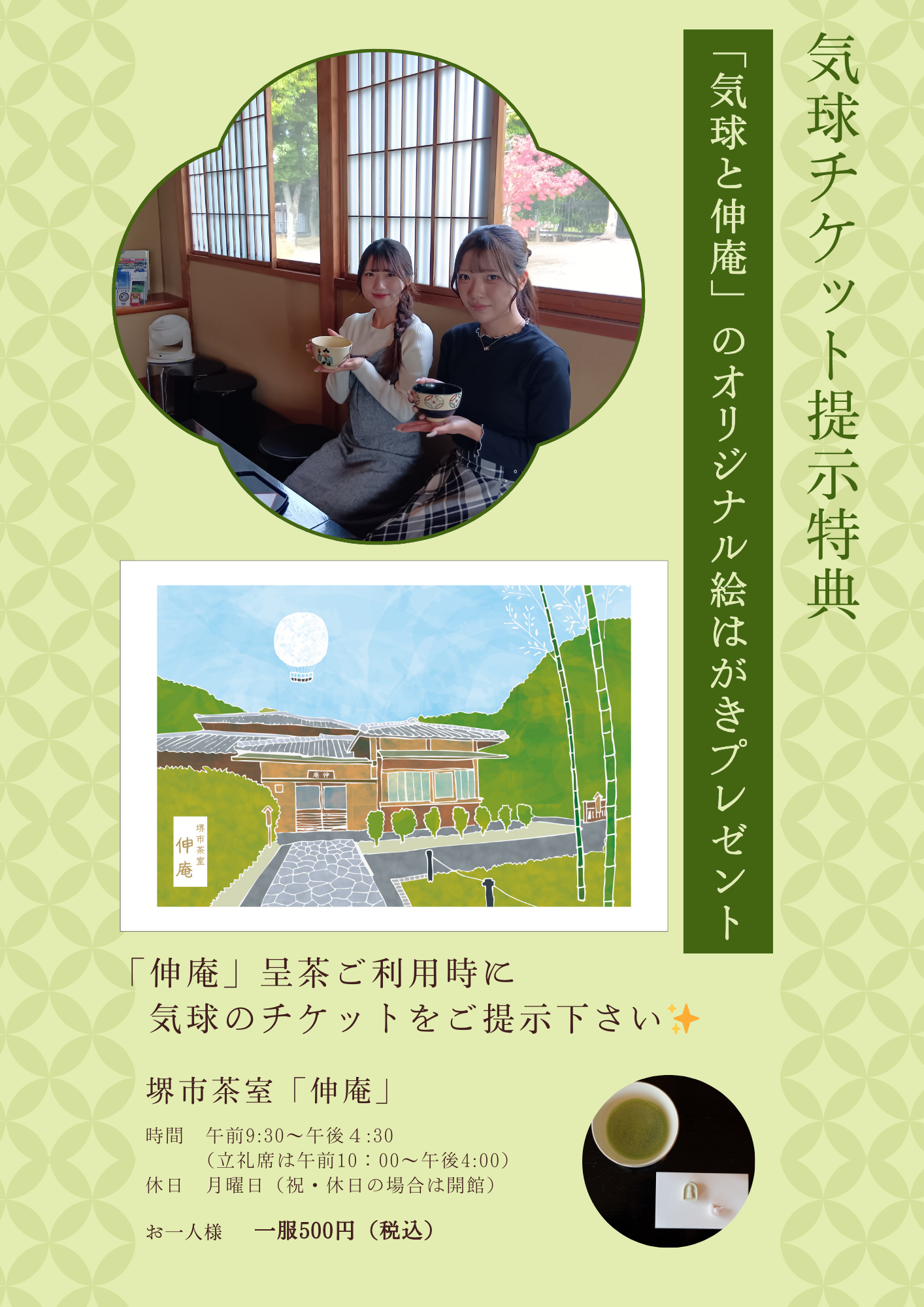 「伸庵」呈茶(座敷呈茶または立礼席)ご利用時、気球のチケット提示で、「気球と伸庵」のオリジナル絵はがきプレゼント中です。