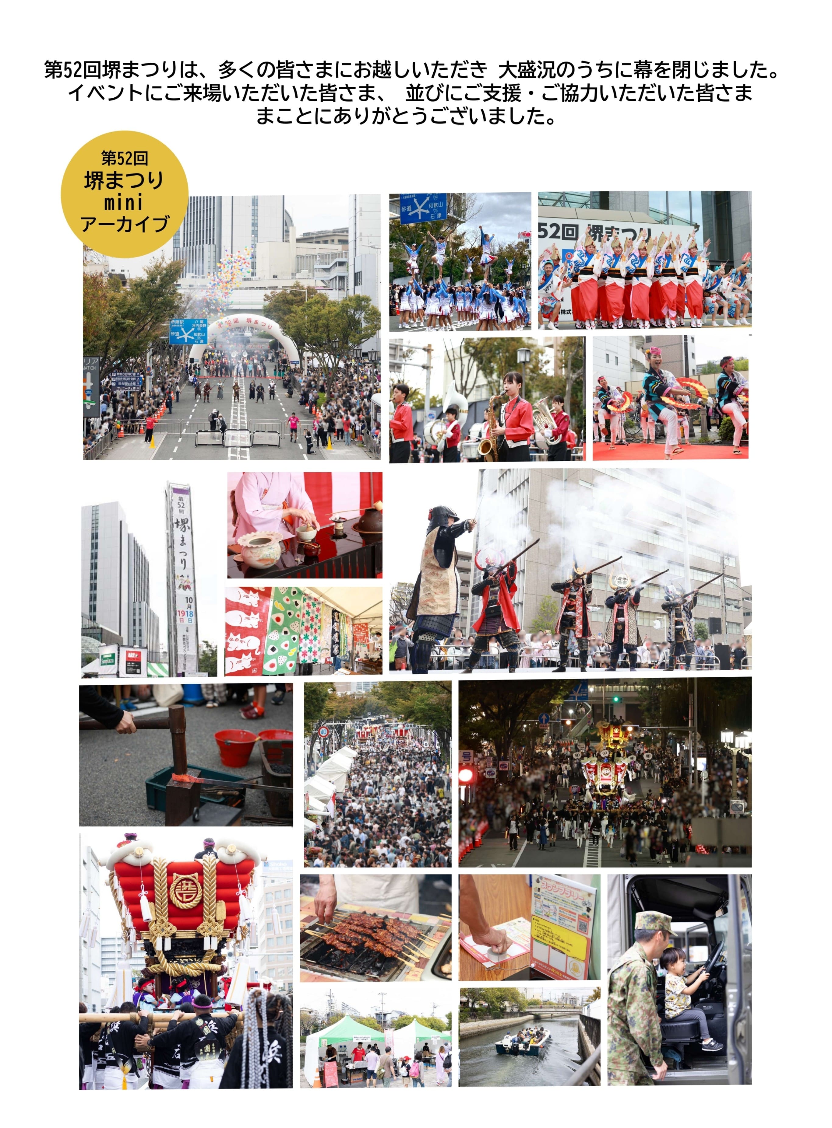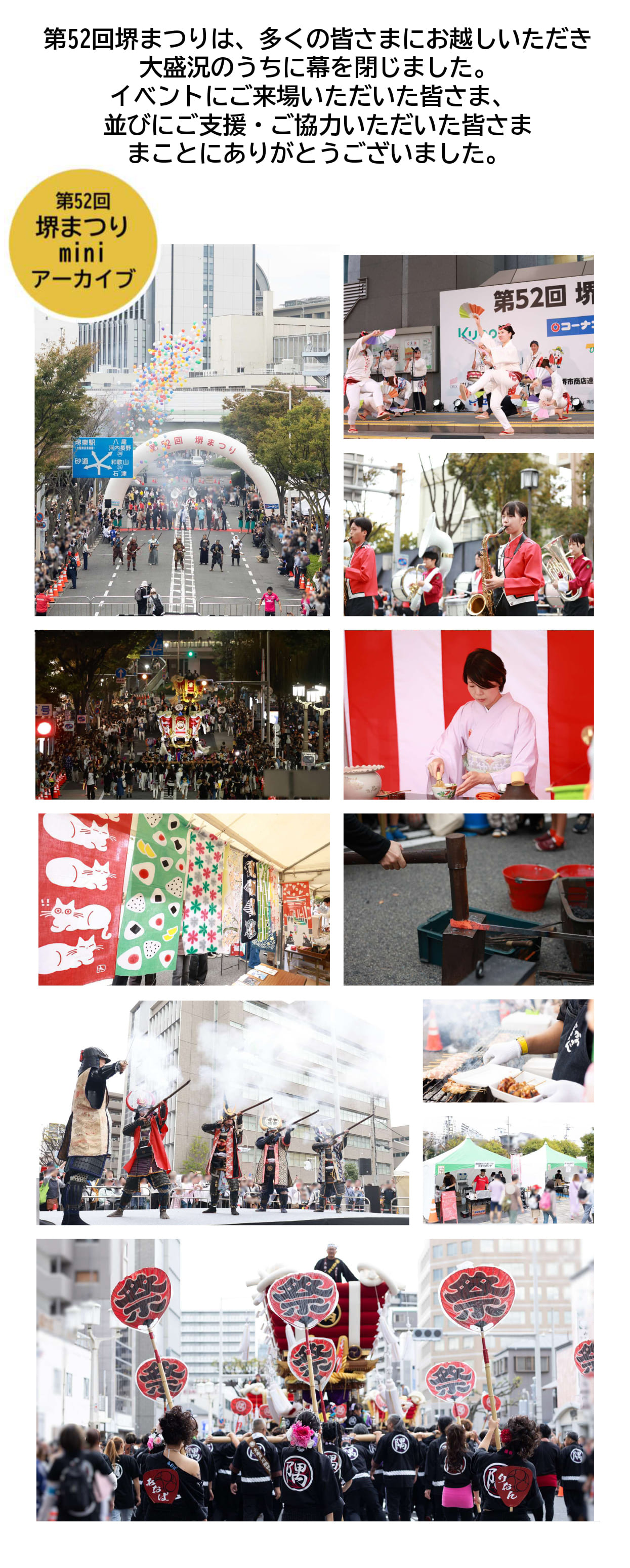 堺まつりは、毎年10月に開催される堺最大のイベントです。昭和49年にスタートし、今回で52回目を迎えます。昨年の第51回には延べ約40万人が訪れました。